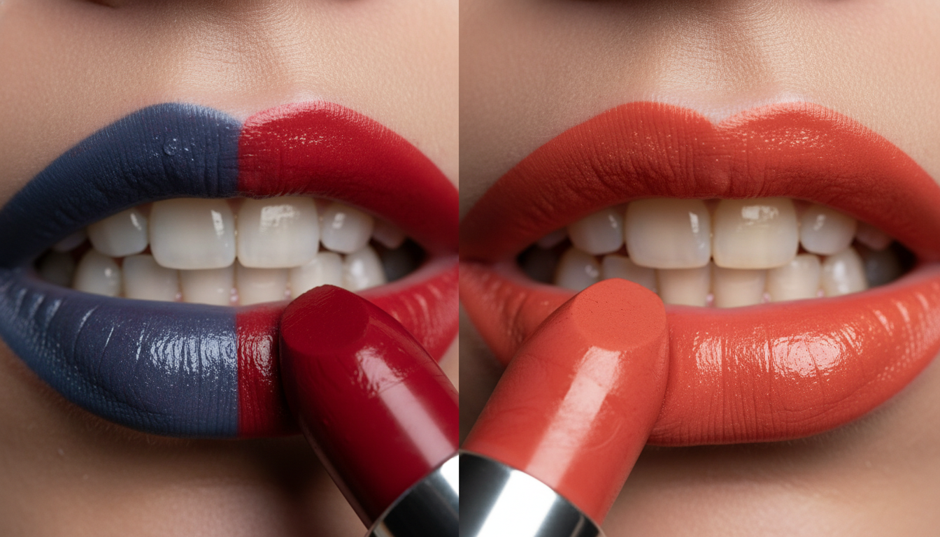 - The ‘Blue-Red’ Rule: Whiten teeth instantly by choosing cool-toned red lipsticks over orange-based shades.